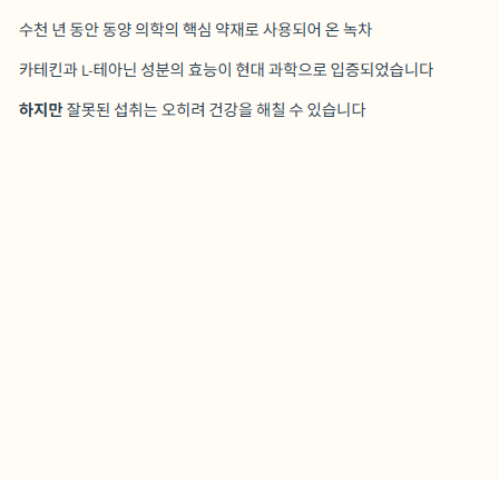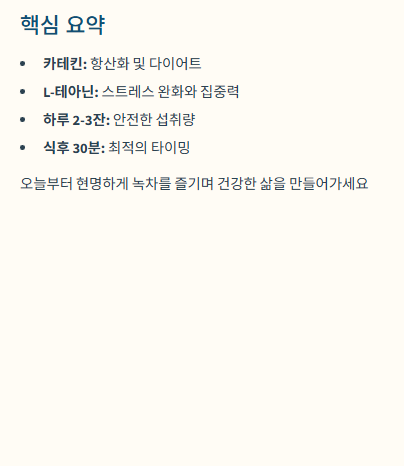 - 최고의 효능: 카테킨은 항산화 및 다이어트에, L-테아닌은 스트레스 완화와 집중력에 기여합니다.