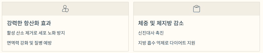 - 1. 강력한 항산화 효과: 활성 산소를 제거하여 세포 노화를 막고 면역력을 강화합니다.