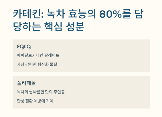 녹차의 쌉싸름한 맛을 내는 카테킨(Catechin)은 폴리페놀의 일종으로, 녹차 효능의 80% 이상을 담당하는 핵심 항산화 물질입니다. 특히 카테킨 중 EGCG(에피갈로카테킨 갈레이트)는 강력한 작용으로 만성 질환 예방에 기여합니다.