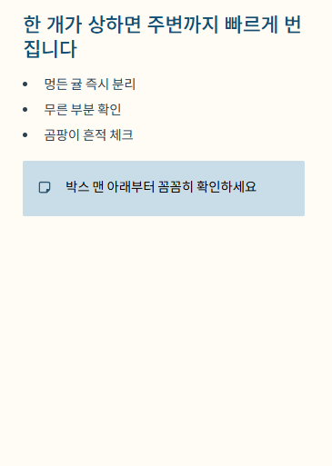 박스 안에 서로 닿아 있다 보니 한 개가 상하면 주변까지 빠르게 번질 수 있습니다.