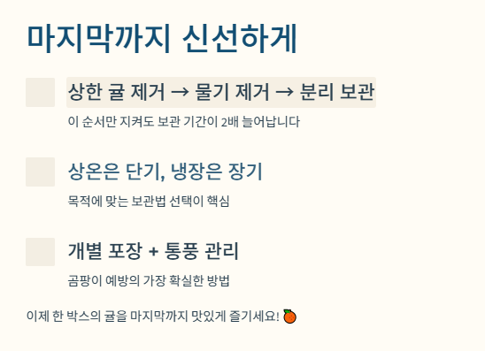 - 상한 귤 제거 → 물기 제거 → 분리 보관이 기본