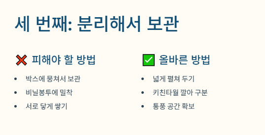 상자째 그대로 두는 방식만 피해도 보관 기간이 크게 늘어나고, 정리와 분리만 잘해도 곰팡이 발생을 상당히 줄일 수 있습니다.
