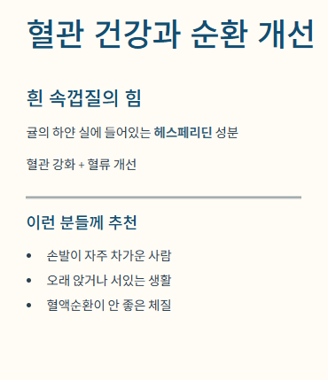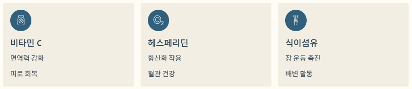 - 플라보노이드(헤스페리딘): 항산화 작용, 혈관 건강