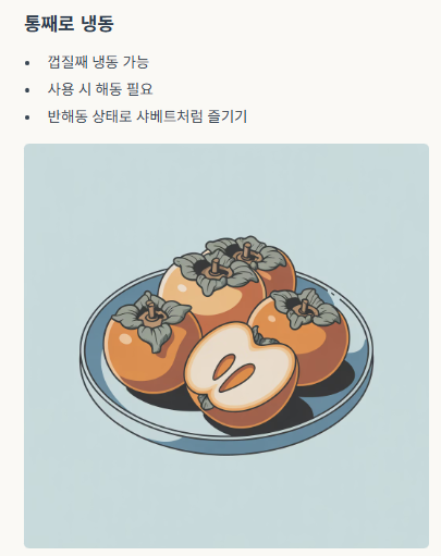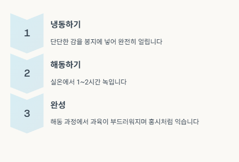 - 해동 과정에서 과육이 부드러워지며 홍시처럼 익습니다.
