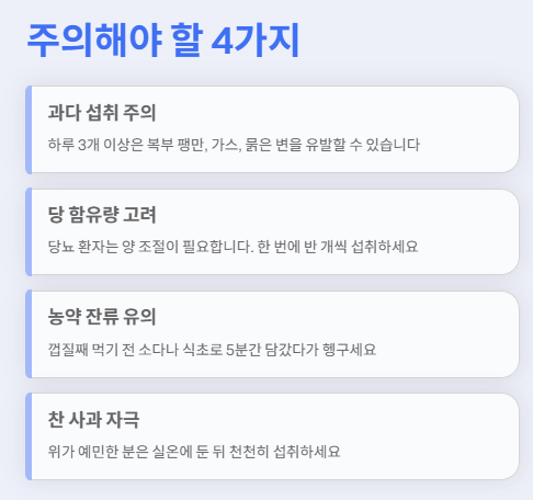 하지만 과다 섭취, 농약 세척 문제, 위 자극 등 알아두면 좋을 주의사항도 분명 존재합니다.