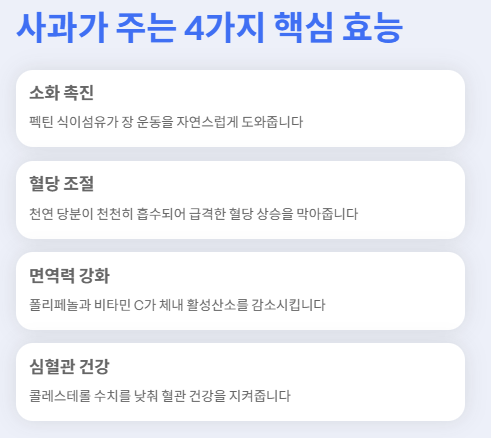 사과는 맛뿐 아니라 소화, 혈당, 면역, 심혈관까지 다양한 건강 효과가 있는 과일입니다.
