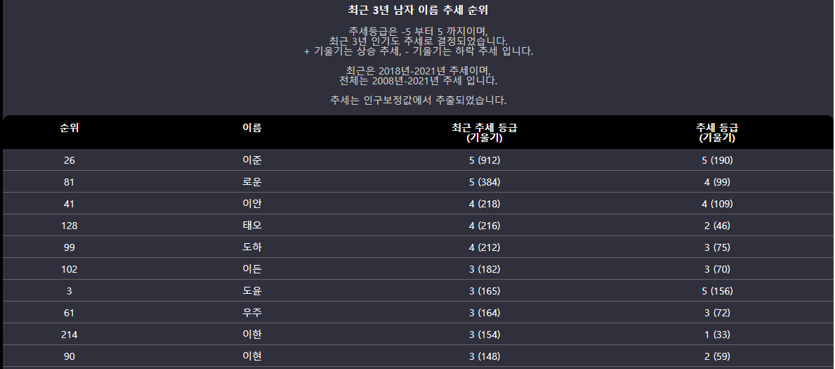 남자 아기 이름 인기 최근 3년 추세에 대한 페이지입니다. 작명을 돕기 위해 2018년~2021년 단기 장기 추세 및 순위를 제공합니다
