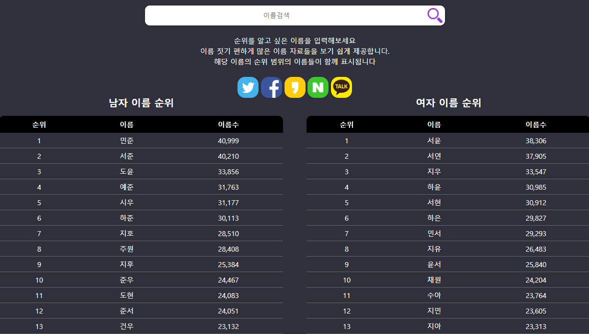 많은 이름들을 보기 좋게 남자, 여자 이름 순위로 제공하고 있습니다.