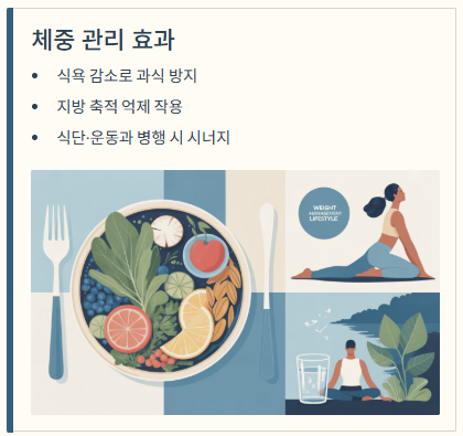 물론 단독으로 체중 감소 효과가 큰 것은 아니며, 식단·운동과 함께할 때 시너지가 납니다.