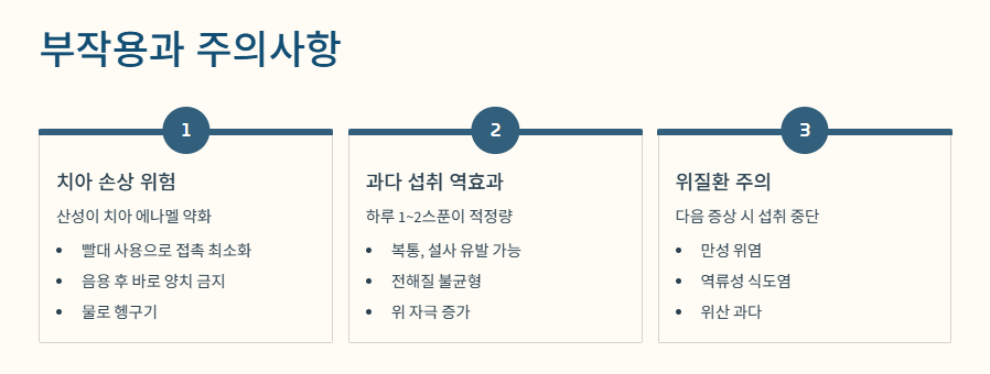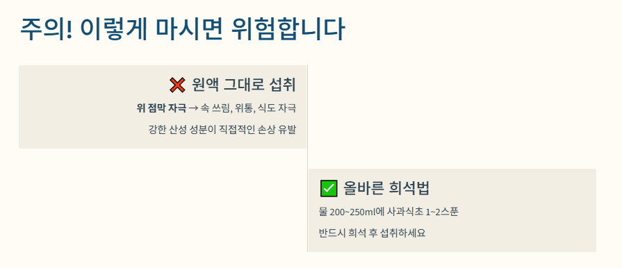 - 원액 섭취는 금물, 반드시 물에 희석해서 마시기