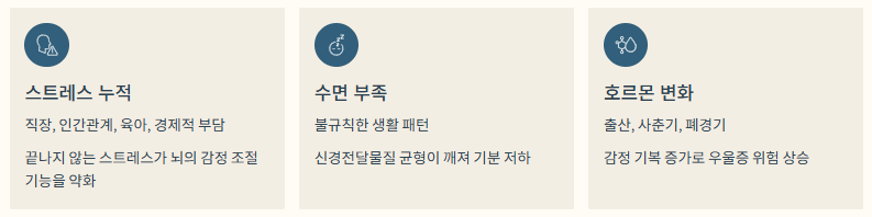 직장, 인간관계, 육아, 경제적 부담처럼 끝나지 않는 스트레스가 쌓이면 뇌의 감정 조절 기능이 약해져 우울감을 유발할 수 있습니다.