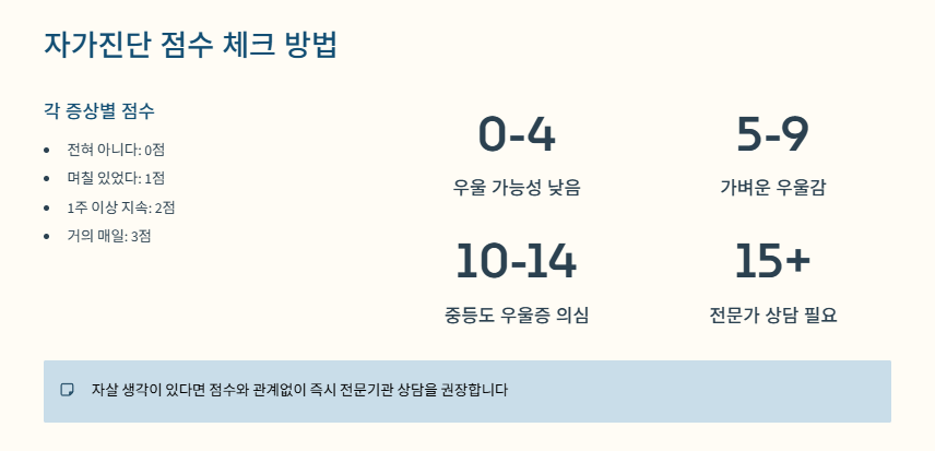 - **자살 생각(9번 항목)**이 있다면 점수와 관계없이 즉시 전문기관 상담 권장