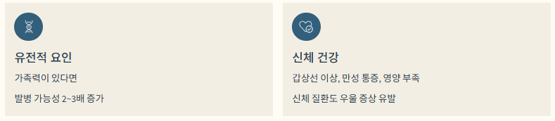 갑상선 기능 저하, 만성 통증, 영양 부족 등 신체 질환 역시 우울 증상을 유발할 수 있습니다.