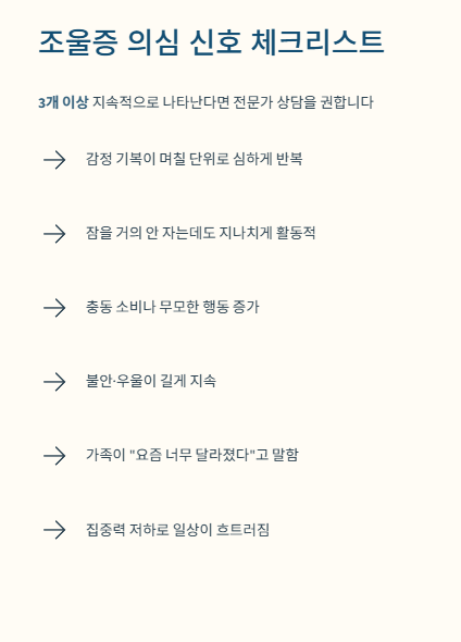 특히 아래 항목 중 3개 이상 지속적으로 나타난다면 전문가 상담이 도움이 될 수 있습니다.