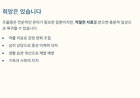 - 필요 시 정신건강의학과 상담·치료 진행