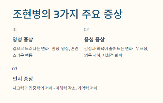 조현병은 크게 양성 증상, 음성 증상, 인지 증상으로 나누어 살펴볼 수 있습니다.
