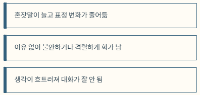 - 혼잣말이 늘고 표정 변화가 줄어듦