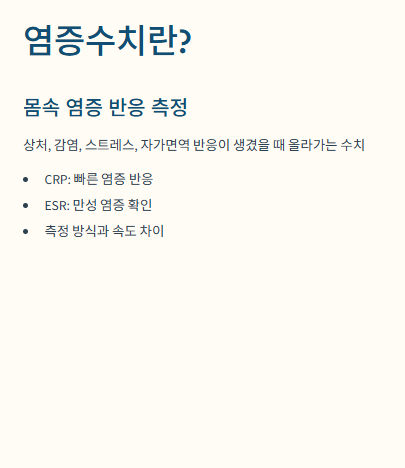 그중 가장 많이 보는 검사가 **CRP(C-반응 단백)**와 **ESR(적혈구 침강속도)**입니다.