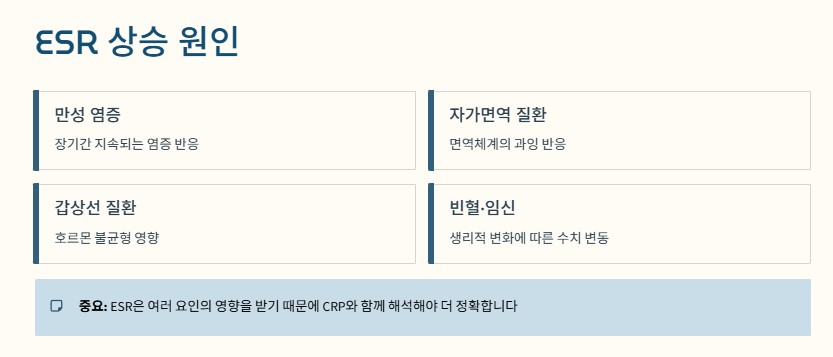 ESR은 여러 요인의 영향을 받기 때문에 CRP와 함께 해석해야 더 정확합니다.
