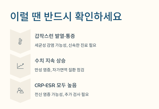 염증수치가 높다고 해서 모두 큰 질환이라는 의미는 아닙니다. 그러나 다음 상황에서는 반드시 체크해야 합니다.
