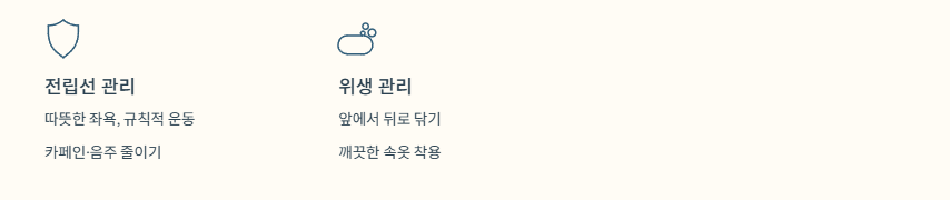 따뜻한 좌욕, 규칙적인 운동, 카페인·음주 과다 섭취 줄이기 등도 도움이 됩니다.
