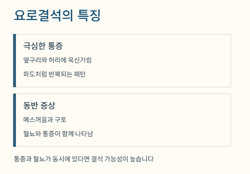 통증과 혈뇨가 동시에 있다면 결석 가능성이 높습니다.