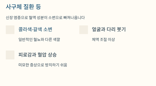 신장에 염증이 생기면 소변으로 혈액 성분이 빠져나옵니다.