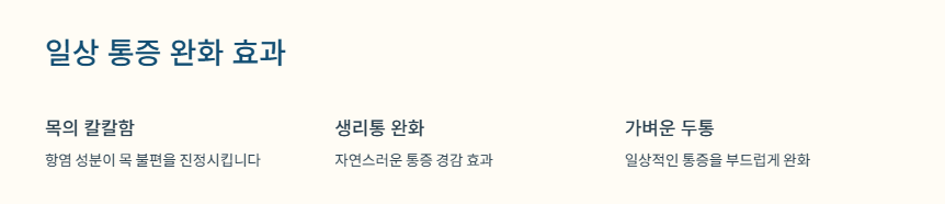 목의 칼칼함, 생리통, 가벼운 두통 등 일상적인 통증을 완화하는 데 도움을 줄 수 있습니다.