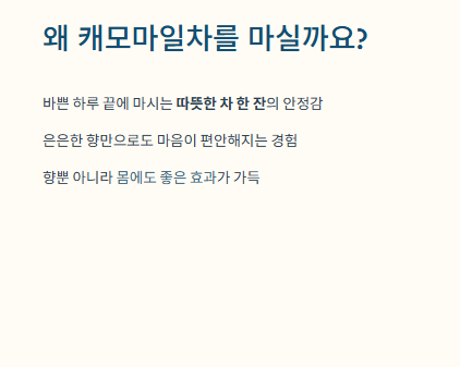 특히 캐모마일차는 은은한 향만으로도 마음이 편안해지는 느낌이 있어 많은 사람들이 즐겨 마십니다.