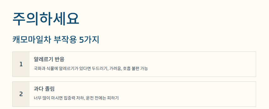 오늘은 캐모마일차의 효능, 그리고 꼭 알아둬야 할 부작용과 주의사항까지 한 번에 정리해드립니다.