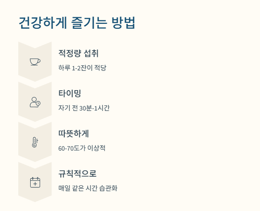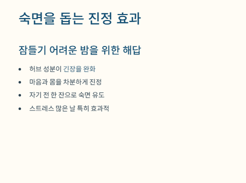 잠이 들기 어렵거나 스트레스가 많은 날, 자기 전 한 잔이 특히 좋습니다.