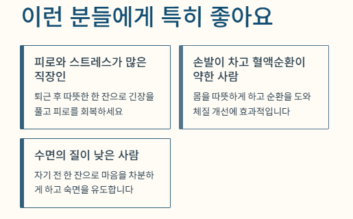 퇴근 후 따뜻하게 마시면 긴장이 풀리고 피로 회복에도 도움됩니다.