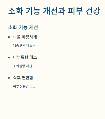 특히 식후 더부룩함, 잦은 체기, 속 냉증이 있는 사람에게 도움이 됩니다.