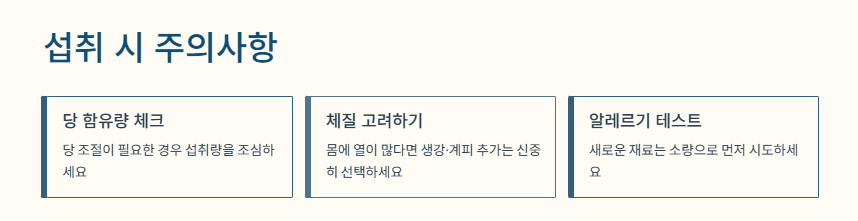- 당 함유량이 많아 당 조절이 필요한 경우 섭취량을 조심해야 합니다.