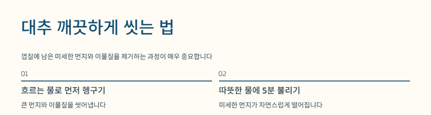- 대추는 흐르는 물 → 미지근한 물 5분 → 손끝으로 문질러 세척