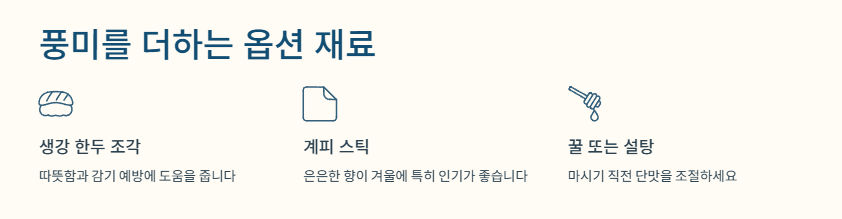 - 몸이 평소 열이 많은 편이라면 생강·계피 추가는 신중히 선택하세요.