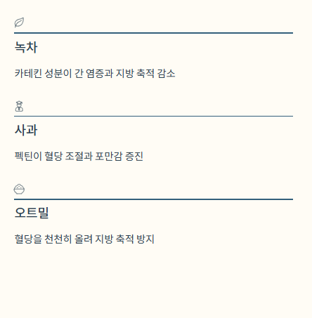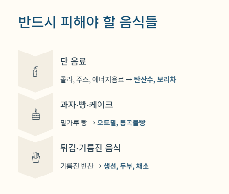 - 단 음료·밀가루·기름진 음식은 줄이는 것이 필수.