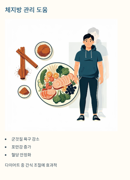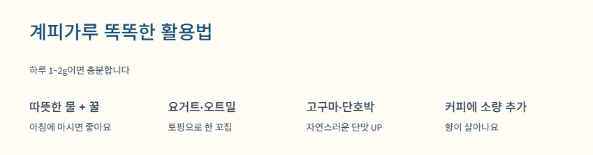 - 계피가루 활용: 오트밀·요거트·계피차 등