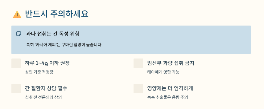 특히 ‘카시아 계피’는 쿠마린(coumarin) 함량이 높아 조심해야 합니다.