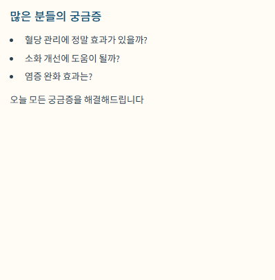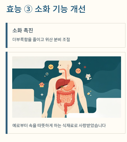 - 주요 효능: 혈당 안정, 염증 감소, 위장 기능 개선, 혈액순환 촉진