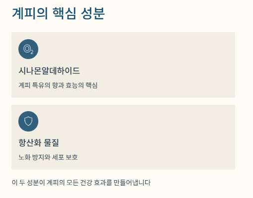 - 계피 핵심 성분: 시나몰데하이드, 항산화 물질