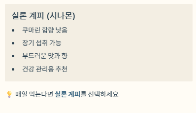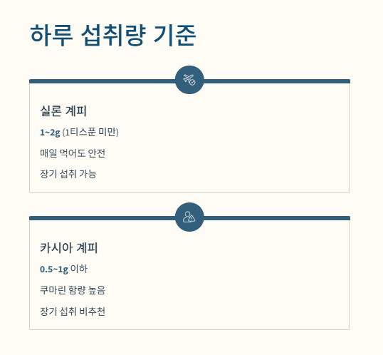 - 매일 먹을 목적이면 **실론 계피(시나몬)**이 안전
