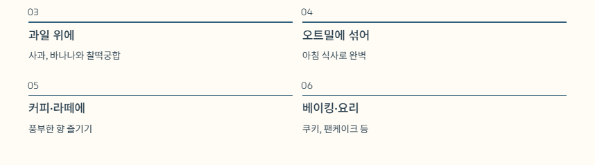 - 스무디 위에 톡톡 뿌려 풍미 추가