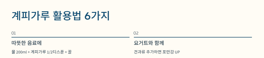 계피가루는 혈당 조절, 항산화, 체온 유지, 다이어트 보조 등 다양한 장점을 가진 재료입니다.