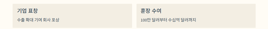 - 수출액 100만 달러부터 수십억 달러까지 다양한 훈장·포상 수여