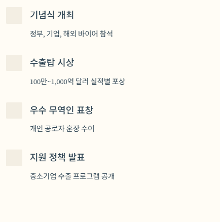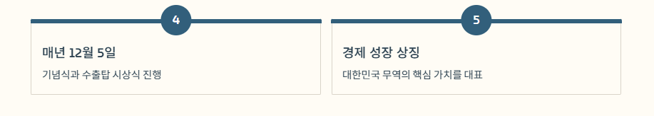 - 매년 12월 5일에 기념식과 수출탑 시상식이 진행