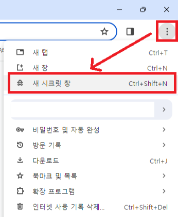 (3) 설정메뉴 상단에 '새 시크릿 창'을 선택하여 시크릿 모드를 시작합니다.