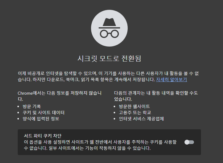 - 정리하면 방문기록, 사이트데이터, 쿠키, 입력정보 등이 저장되지 않습니다.