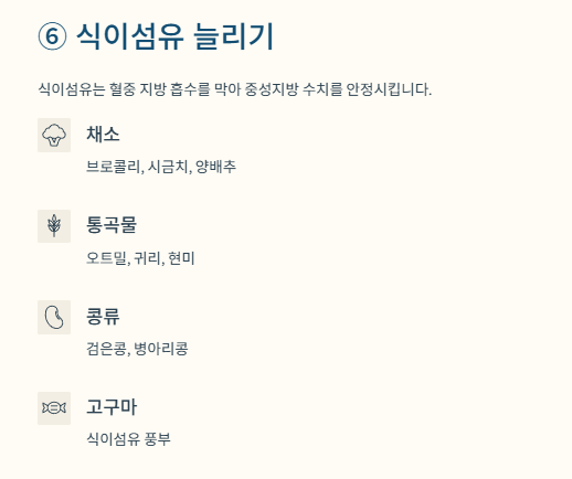 식이섬유는 혈중 지방 흡수를 막아 중성지방 수치를 안정시킵니다.