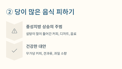 커피는 무가당, 간식은 견과류나 과일 소량으로 바꿔보세요.